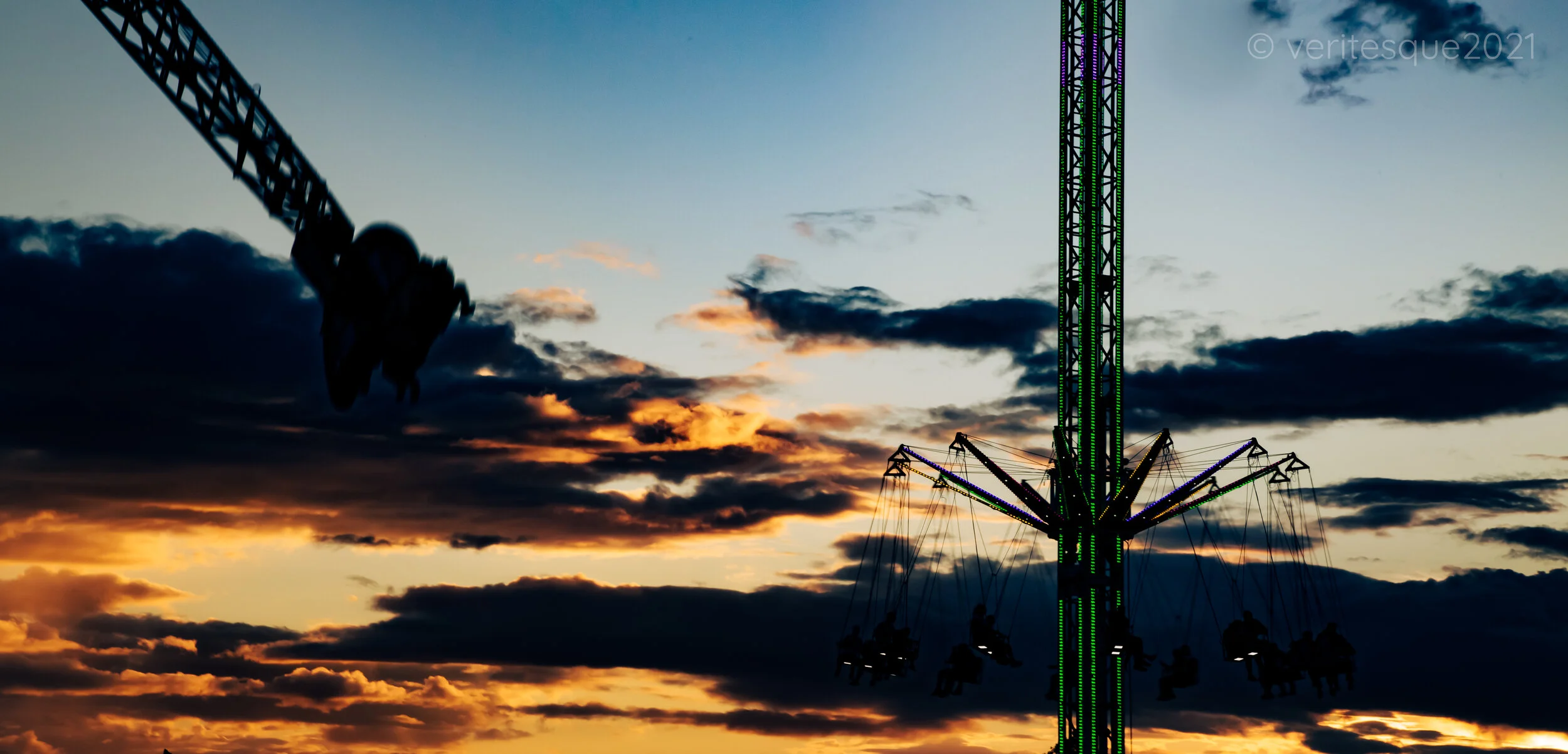 Northampton Town Fair, Opening Night, Aug 2021On a split-second hunch I grabbed my Canon and ran over to the Town Fair on the Racecourse. Magic Hour was well underway, and the sunset was clashing with the neon in incredible ways.